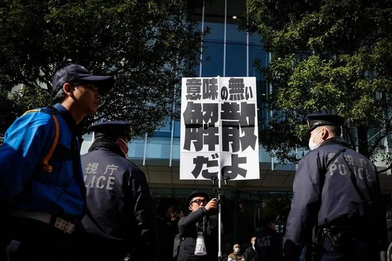 1月27日,在日本東京秋葉原車站附近舉行的日本首相、自民黨總裁高市早苗的街頭演講活動中,民眾舉起抗議標語。