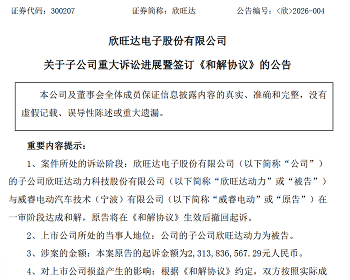 此前于2025年12月,威睿電動因與欣旺達動力發生買賣合同糾紛,達成向浙江省寧波市中級人民法院提起訴訟,和解要求欣旺達動力履行支付賠償金等款項的億訴義務,起訴金額超過人民幣23.13億元。訟落